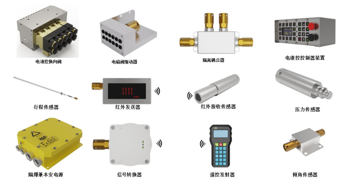 # 系统配置 #  液压支架电液控制系统由支架控制器、电磁阀驱动器、电液控换向阀、直流稳压电源、电源适配器、隔离耦合器、信号转换器、遥控接收器、红外线发射/接收器及压力、行程、倾角、接近等多种传感器组成。