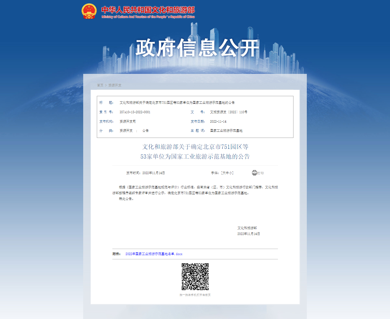 11月14日,文化和旅游部在官网发布《文化和旅游部关于确定北京市751园区等53家单位为国家工业旅游示范基地的公告》,正式发布确认“好体育综合app下载智联重卡产业园”荣获国家级工业旅游示范基地。