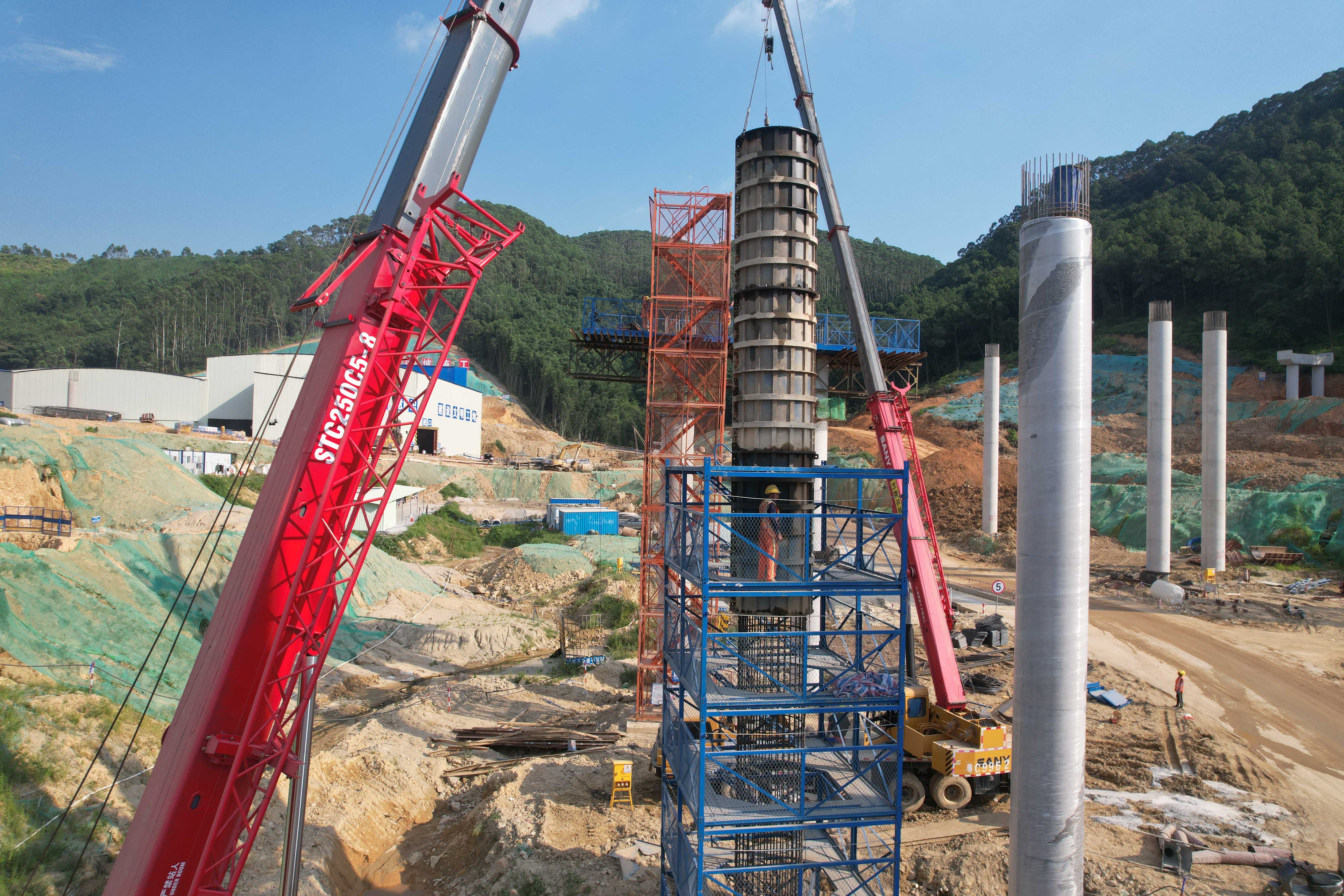 今年6月初,STC500C5-8和STC250C5-8两台插电起重机,正式进驻增城至天河高速公路施工,负责该工地上套筒模板吊装及钢筋装卸等工作。