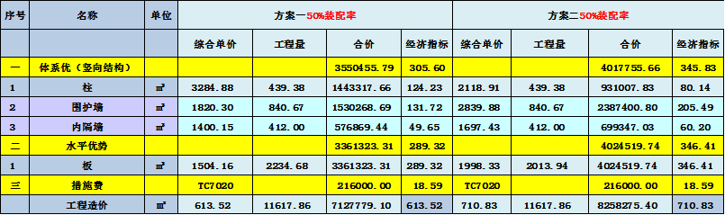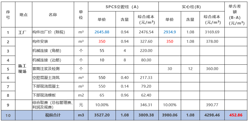(3)为了进一步分析其成本优势,按照《湖南省装配式建筑评价标准》DBJ 43/T542-2022,在满足装配式50%的情况下,本项目方案一采用竖向结构使用SPCS,外围护采用ALC墙板;方案二采用水平叠合板,外围护采用外挂实心墙。方案一和方案二其他因素保持一致。经过我们详细测算,发现方案一比方案二便宜97元/㎡,其对比过程详见表4。