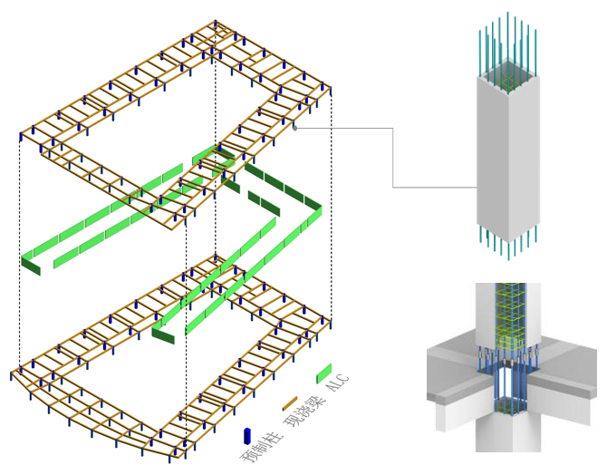 本项目在建筑工业化应用方面,采用装配式建筑方式进行建造,1#中学教学楼与综合楼、2#小学教学楼、3-1#食堂、风雨操场、3-2#实验楼、4#报告厅均采用SPCS空腔柱装配式建造体系,其外墙均采用ALC板材,应用面积达80%以上,项目装配率达到50%,体现了装配式住宅项目“建筑工业化”的高超水准。其中1#中学教学楼SPCS预制构件和ALC板材布置图详见图5。
