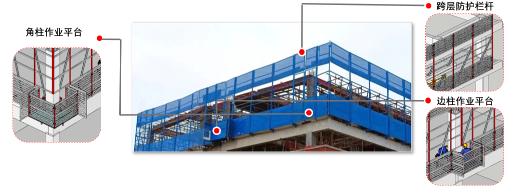 同时采用SPCS技术结构体系匹配的工模技术和安全措施,可免去外脚手架搭设,节省施工措施费,同时仅在施工作业面内施工更加安全。其中工模夹具和面内作业相关技术措施详见图7。