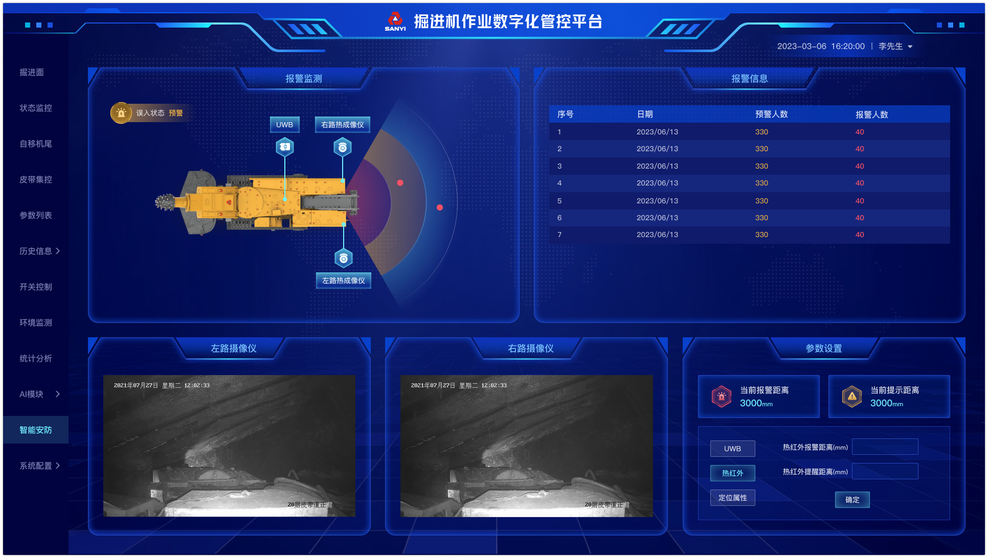 智能安防系统融合UWB电子围栏报警停机、热成像人员AI识别报警停机、信息传输WiFi覆盖、声光报警等功能,功能高度集成于智能安防主机中,智能安防主机布置于掘进机机身,位置布局合理,无需人工移位。